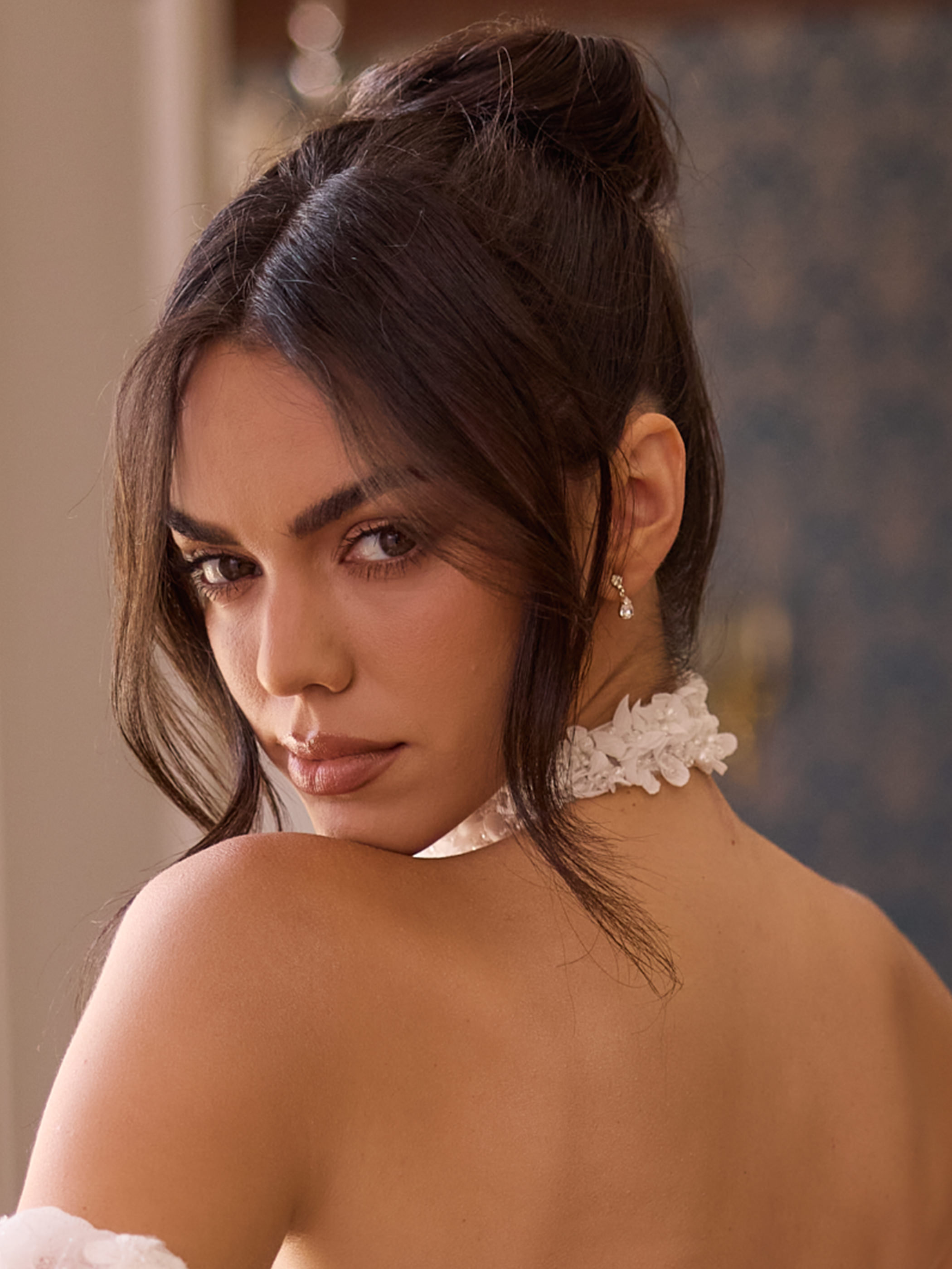 Feines Choker-Halsband für die Braut, verziert mit zarten 3D-Blumen und funkelnden Kristallen. Das Design greift den natürlichen Charme des Boho-Stils auf und rundet den Braut-Look mit einem stilvollen Akzent ab. Ein elegantes Schmuckstück, das Romantik und moderne Leichtigkeit verbindet.