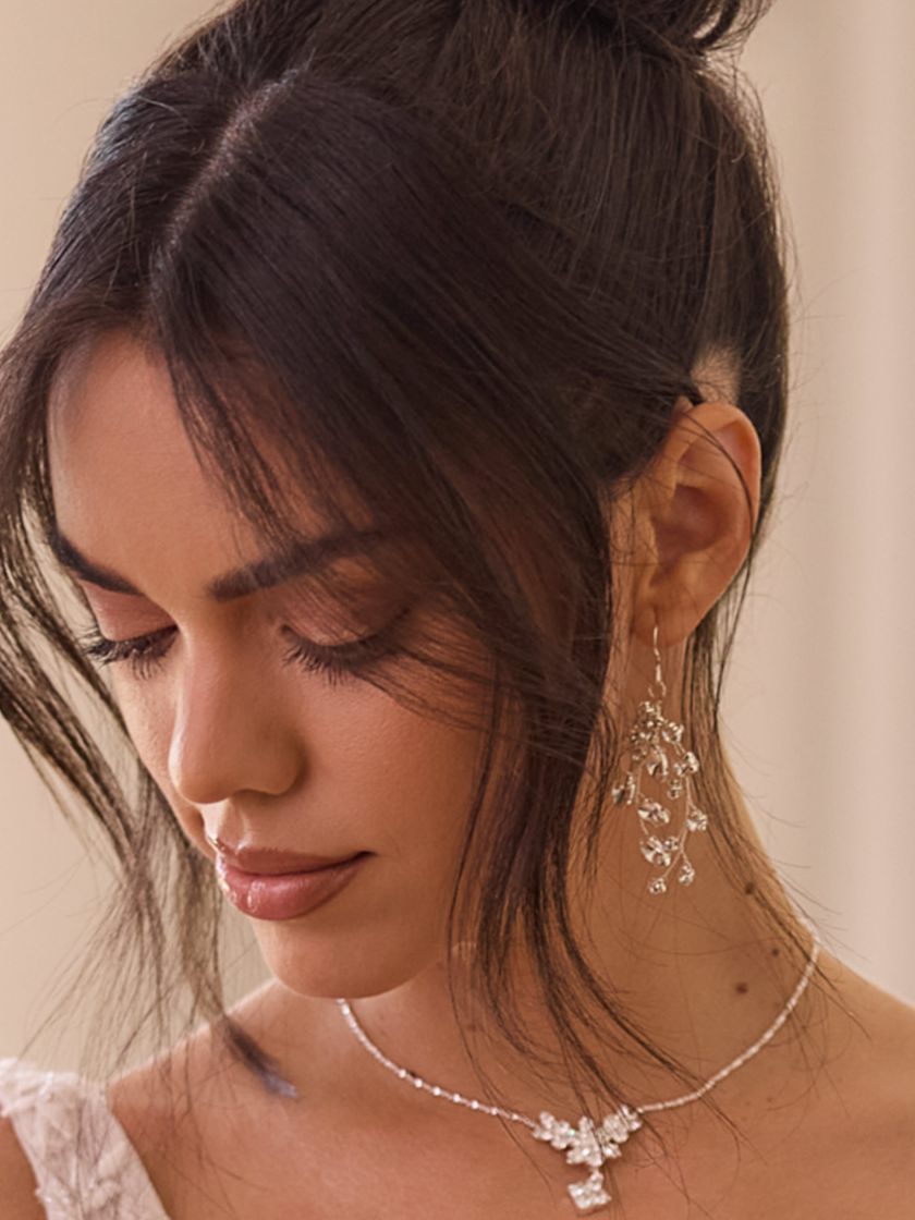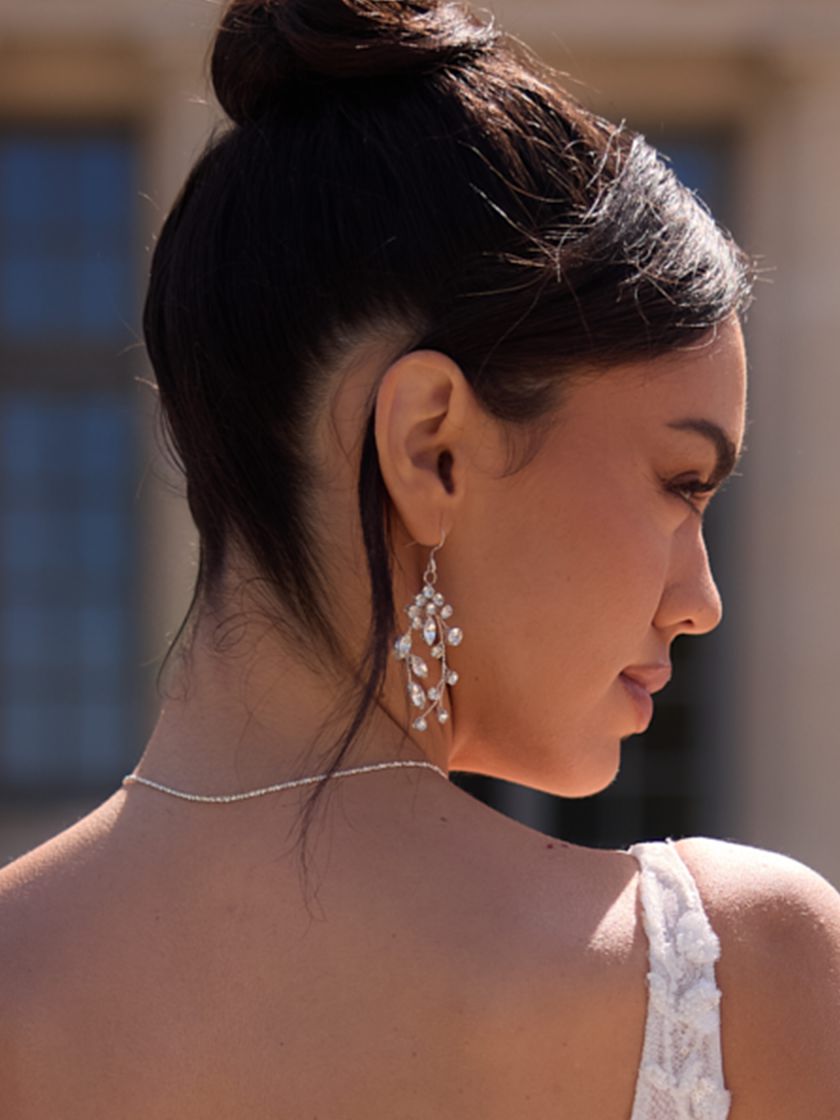 Elegante Ohrringe mit funkelnden Zirkonia-Steinen und offenem Hakenverschluss. Das versilberte, nickelfreie Design ist hypoallergen und angenehm zu tragen. Diese klassischen Ohrringe sind ein zeitloses Accessoire, das jeden Braut-Look stilvoll ergänzt.
