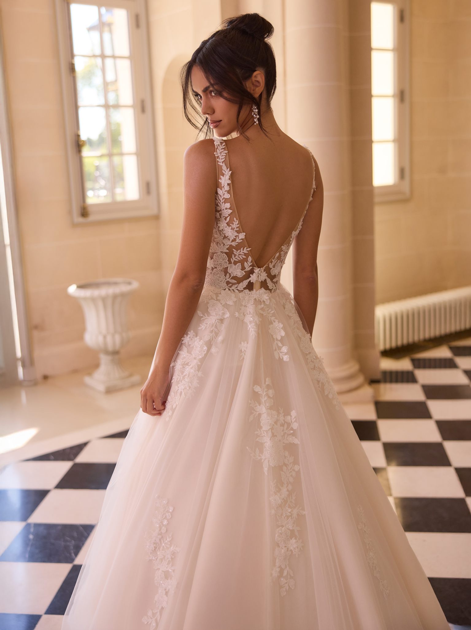Modern, klar, selbstbewusst: Dieses bodenlange Prinzessinnen-Brautkleid aus edler Spitze und funkelndem Kristalltüll betont eine natürliche Taille und setzt mit transparentem V-Rückenausschnitt ein luxuriöses Statement. Der V-Ausschnitt mit Illusion-Effekt und das ärmellose Design unterstreichen die moderne Eleganz. Handgestickte Spitzendetails und eine prachtvolle, vollständig bestickte Schleppe verleihen dem Look royale Ausstrahlung. Der Rücken schließt mit einem Reißverschluss. Ideal für klassische Schlossfeiern, festliche Trauungen oder elegante Hochzeitszeremonien.