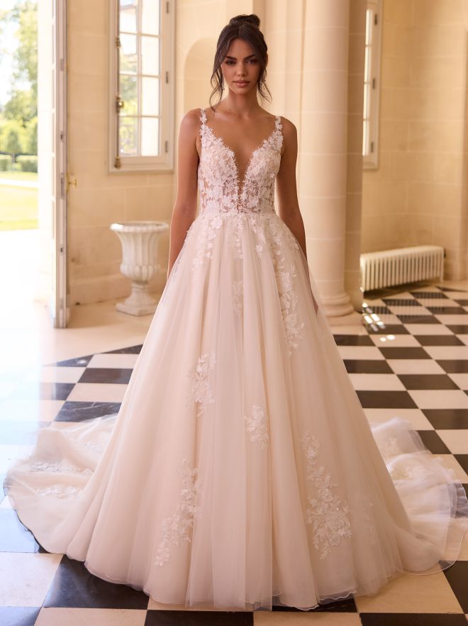 Modern, klar, selbstbewusst: Dieses bodenlange Ballkleid aus hochwertiger Guipure-Spitze betont eine natürliche Taille und setzt mit seinem spitz zulaufenden, geraden Rückenausschnitt ein elegantes Statement. Die langen Trompetenärmel verleihen dem Design eine ausdrucksstarke Silhouette. Perlenstickereien an der Taille ziehen den Blick auf die feine Handarbeit. Der Rücken schließt mit einem Reißverschluss. Ideal für festliche Hochzeiten, glamouröse Abendempfänge oder den großen Auftritt auf dem Parkett.