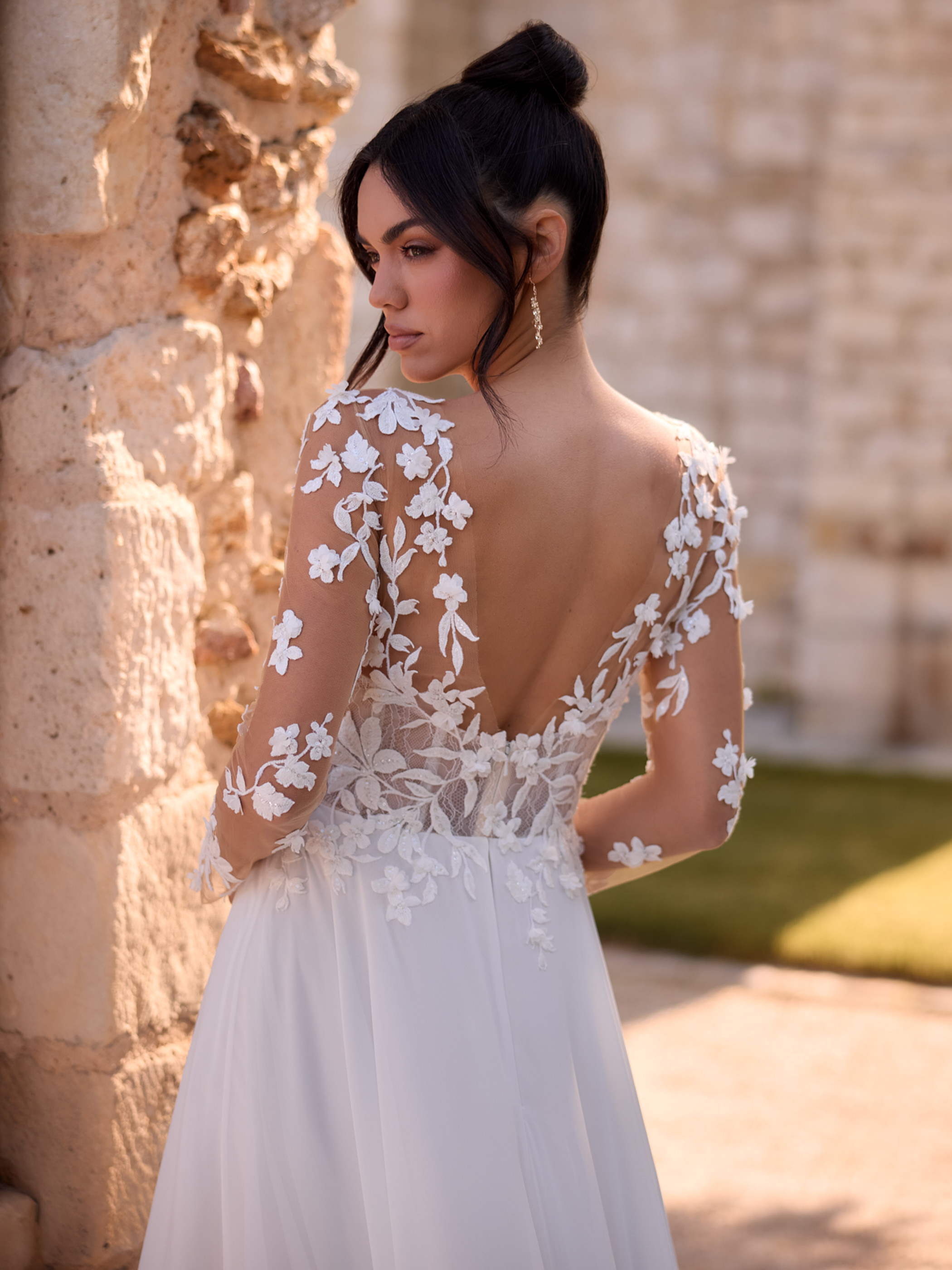 Modern, klar, selbstbewusst: Dieses bodenlange Boho-A-Linienkleid aus Chiffon und feiner Spitze betont eine natürliche Taille und setzt mit transparentem, geradem Rücken ein edles Statement. Der V-Ausschnitt und die langen Illusionsärmel verleihen dem Design feminine Eleganz. Das Oberteil mit floraler Baumwollspitze wirkt romantisch und detailreich. Eine lange Schleppe rundet den königlichen Look harmonisch ab. Der Rücken schließt mit einem Reißverschluss. Ideal für Boho-Hochzeiten, freie Trauungen oder festliche Sommerfeiern.