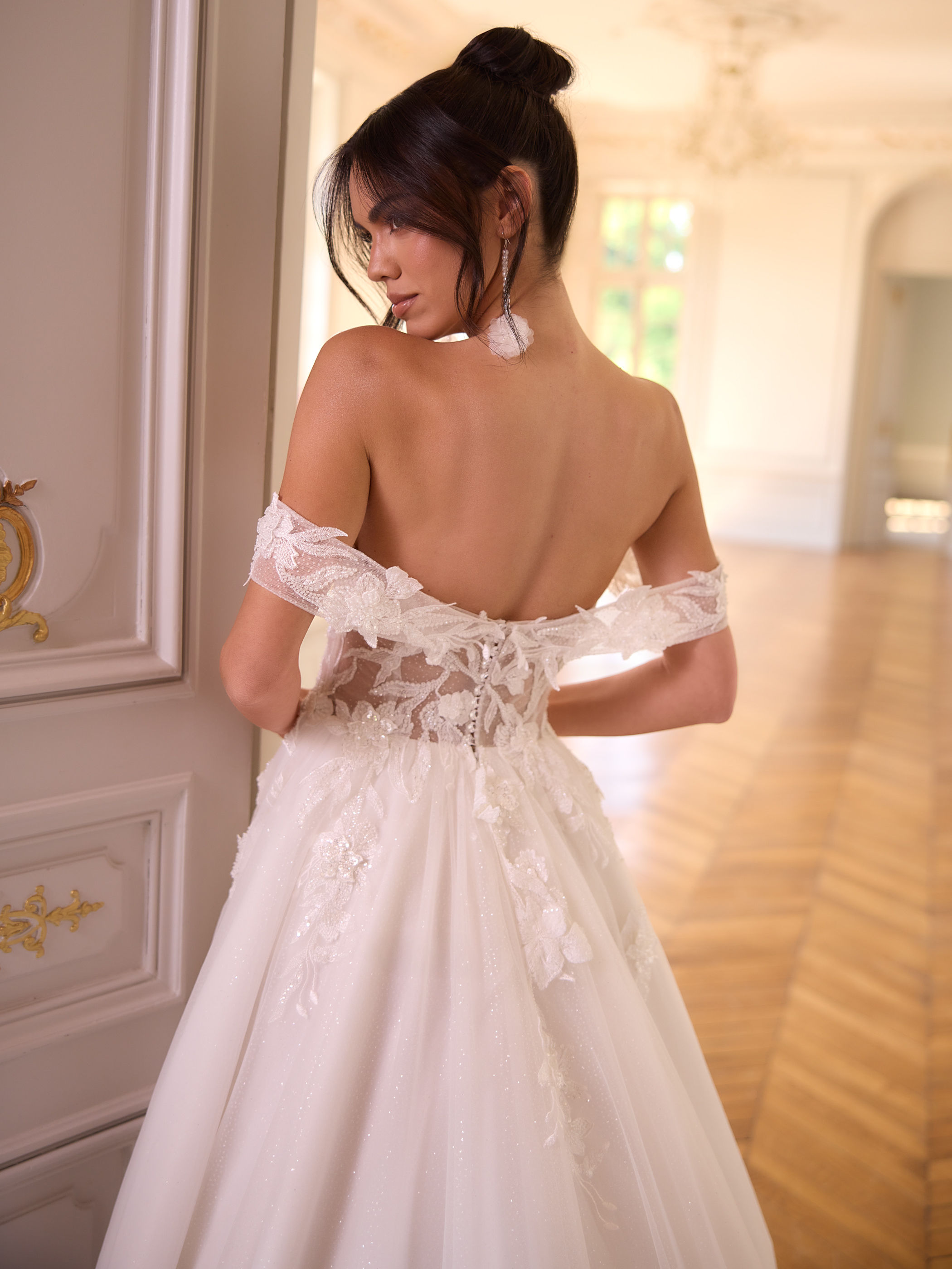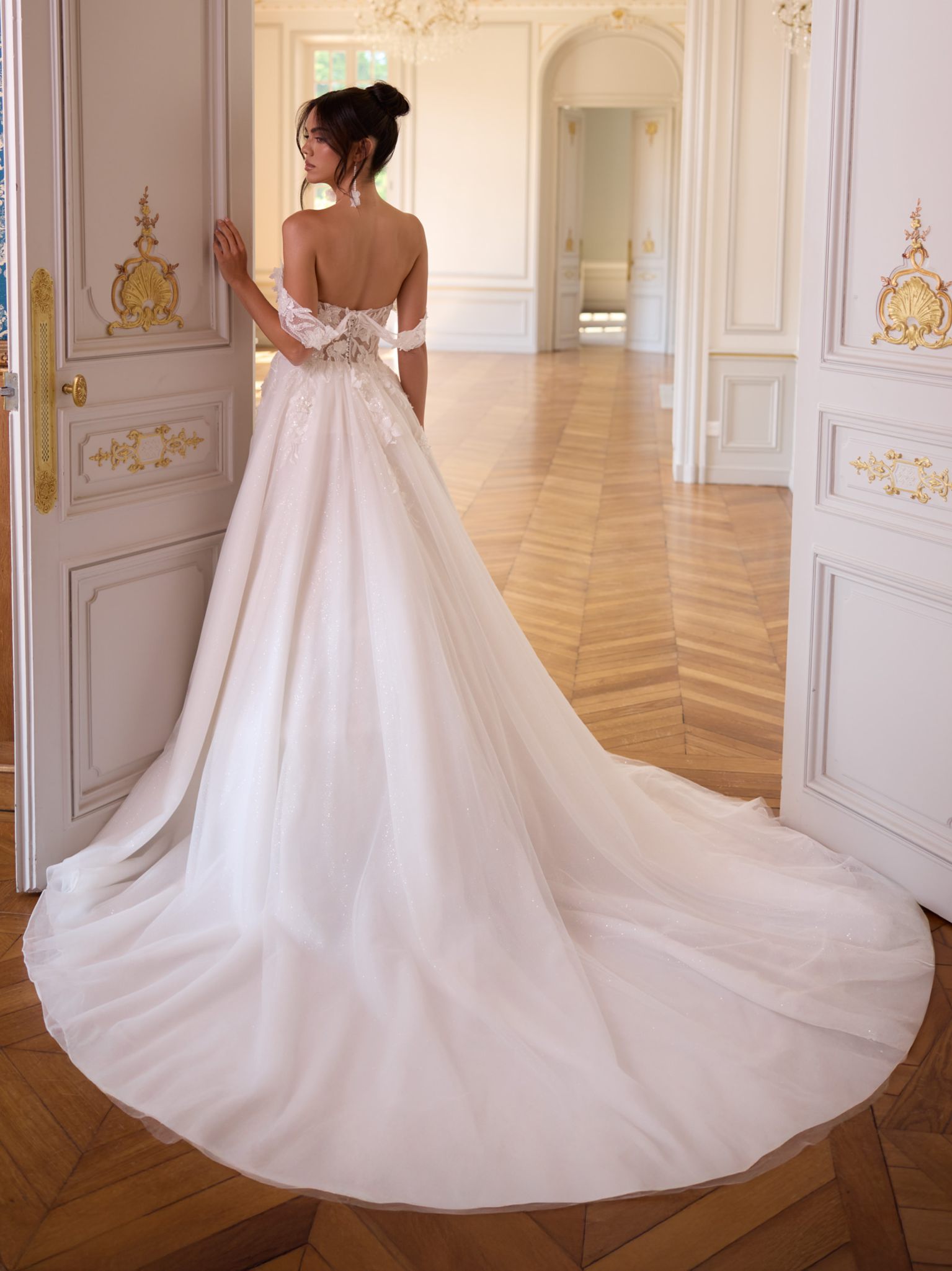 Modern, klar, selbstbewusst: Dieses bodenlange Prinzessinnen-Brautkleid aus hochwertiger Kristallspitze und glitzerndem Tüll betont eine natürliche Taille und setzt mit geradem Rücken ein elegantes Statement. Der schulterfreie Ausschnitt und das ärmellose Design schaffen eine feminine Linienführung. Die lange Schleppe sorgt für einen eindrucksvollen Auftritt. Das Oberteil ist mit floraler Kristallspitze bestickt und zeigt feine Details. Der Rücken schließt mit einem Reißverschluss, akzentuiert durch Kristallknöpfe. Ideal für klassische Zeremonien, repräsentative Empfänge oder märchenhafte Hochzeiten.