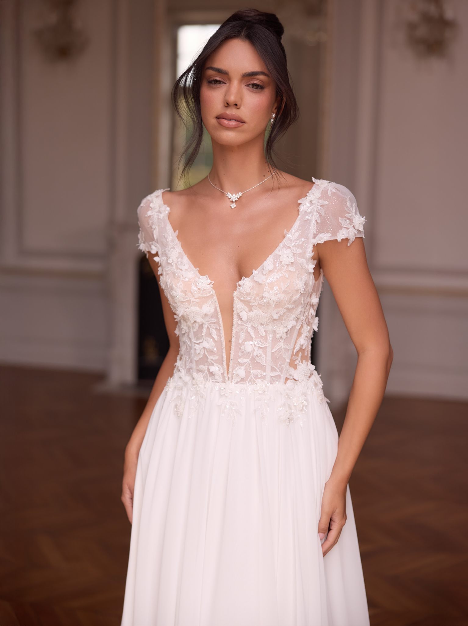Modern, klar, selbstbewusst: Dieses bodenlange Boho-A-Linienkleid aus hochwertigem Chiffon und Spitze betont eine natürliche Taille und setzt mit tiefem V-Rücken ein elegantes Statement. Der V-Ausschnitt und die kurzen Cap-Ärmel schaffen eine feminine Silhouette. Das Oberteil ist aufwendig bestickt und mit 3D-Blumenspitze veredelt. Eine lange Schleppe verleiht dem Kleid royalen Charakter. Der Rücken schließt mit Reißverschluss, akzentuiert durch dekorative Knöpfe. Ideal für Boho-Hochzeiten, freie Trauungen oder sommerliche Festlichkeiten.