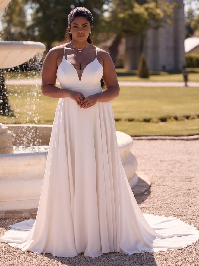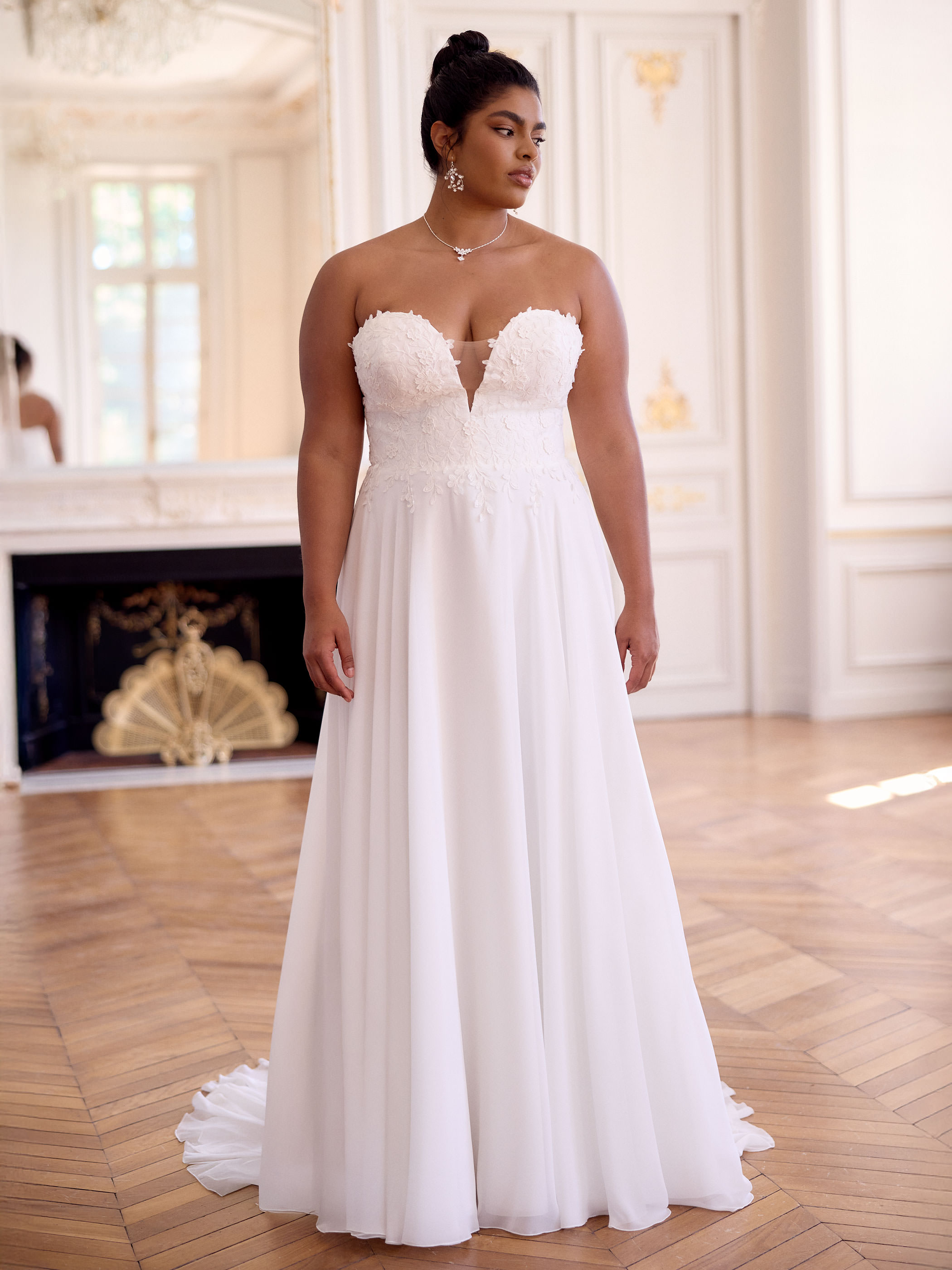 Modern, klar, selbstbewusst: Dieses bodenlange Prinzessinnen-Brautkleid aus feinem Chiffon und bestickter Spitze betont eine natürliche Taille und setzt mit offenem Rücken ein romantisches Statement. Der Sweetheart-Ausschnitt und das florale Spitzen-Design verleihen dem Look feminine Leichtigkeit. Die lange Schleppe sorgt für einen eindrucksvollen Auftritt. Der Rücken schließt mit einem Reißverschluss und Haken. Ideal für klassische Trauungen, romantische Gartenhochzeiten oder elegante Feierlichkeiten.
