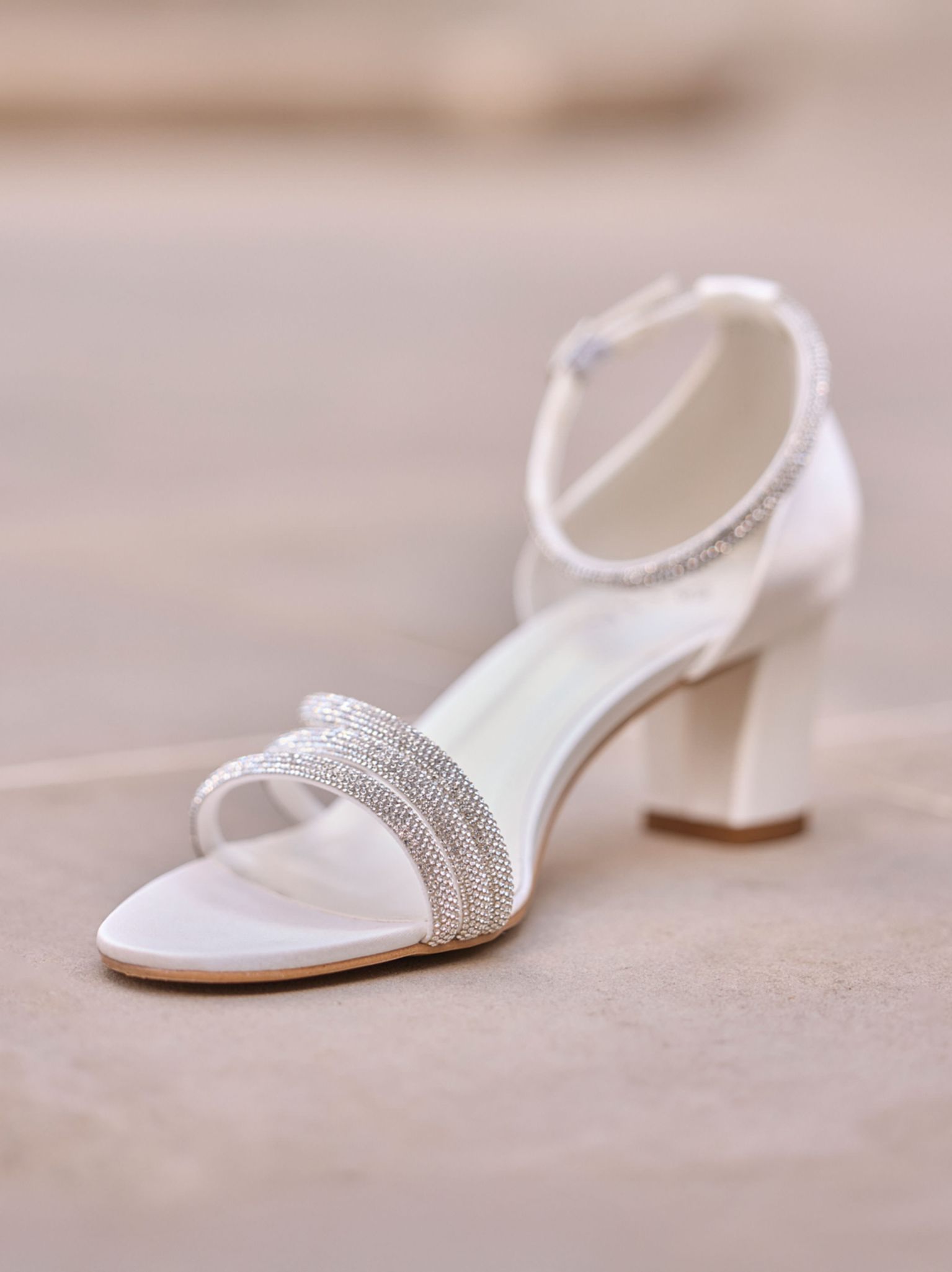 Modern, klar, selbstbewusst: Diese Braut-Sandale aus edlem Satin vereint Komfort und Eleganz. Feine Kristalle an Knöchel- und Zehenriemen setzen glanzvolle Akzente und unterstreichen den stilvollen Look. Der 6 cm Absatz formt eine feminine Silhouette, während der Knöchelriemen sicheren Halt und angenehmen Tragekomfort bietet – perfekt für Hochzeit, Empfang oder den Tanz am Abend.